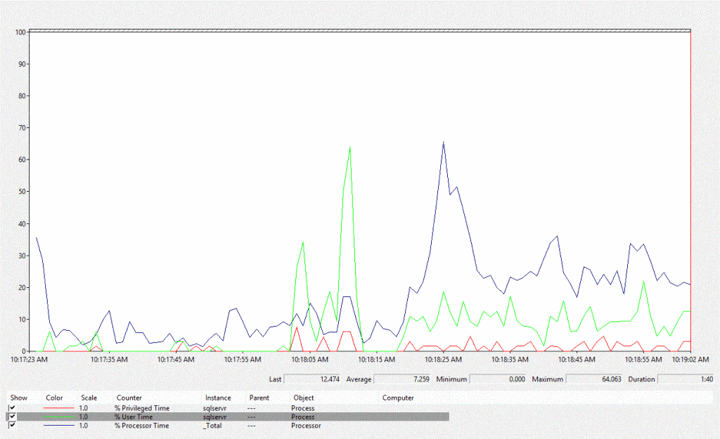 What are some of the things that require CPU in SQL Server? When dealing with processor related issue, we need to know what might cause CPU utilization and what kind of utilization we have (privileged or user)? Before we start troubleshooting any kind of issue on the server, please ask the first obvious question? Is it really sqlservr.exe (SQL Engine) causing the issue? In CPUs case it is pretty easy, we can look at task manager. However if we wanted to look at the Windows Performance Monitor (perfmon), then we might want to look at least three counters; Processor\% Processor Time (_Total), Process\% User Time (sqlservr), and Process\% Privileged Time (sqlservr).