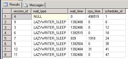 select session_id, wait_type, wait_time, cpu_time, scheduler_id