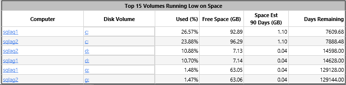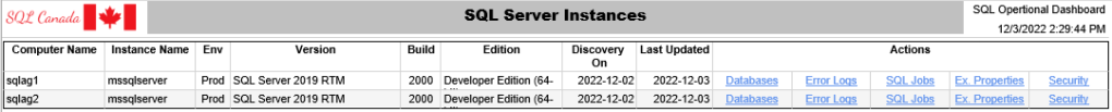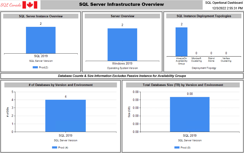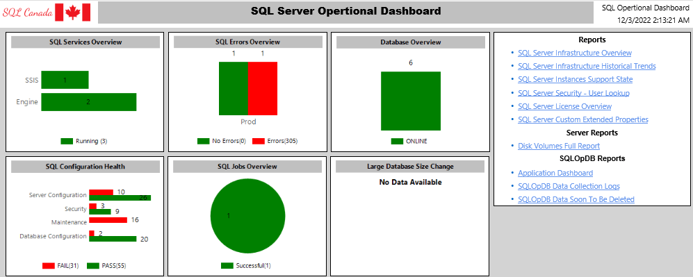 The SQL Server Operational Dashboard (SQLOpDB) provides currents state of the SQL Server infrastructure. The landing page (above) provides health of all services, number of instances returning errors, current health of databases, configuration health as per Microsoft Best practices, SQL Job health, and last but not least unexpected database growth (missing in graph). Example of some of the reports below: