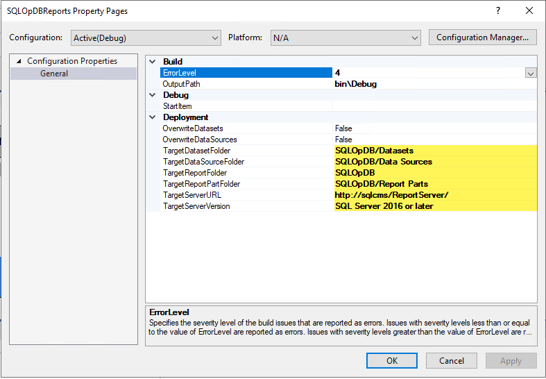 Next update the deployment location. Right click on the project “SQLOpDBReports” and go to the Properties. Update all the highlighted values below.