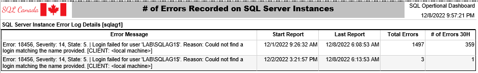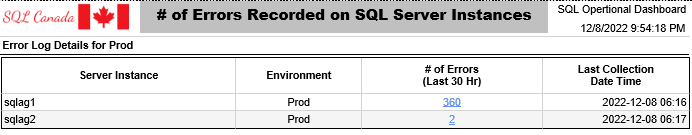 This report shows all the errors reported in last 30 hours. The data collection has protection to minimize data collection to last 30 hours. This protection is to prevent a full error log scan on new servers, or servers where data collection might have failed.