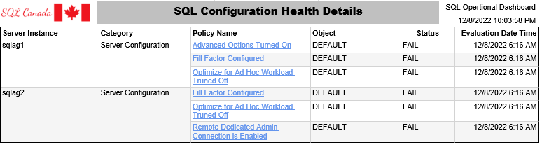 Further drilling into report provides details on which policies are failing by policy name. Policy name in above report do not match below report due to mapping from Short Name (for display purpose) to Long Name (for detail description).