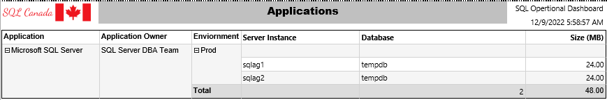 If you select the application you’ll be able to see granular view of database name, size, and SQL instances the application is supported on.